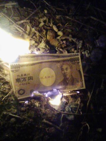 前から手に入れておいたおもちゃのお金を200万円ほど火にくべて、ご先祖様に語りかけます。
