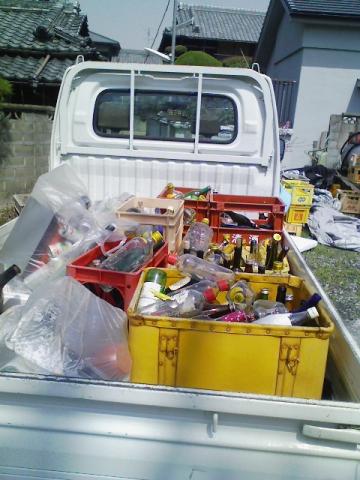 とりあえず日焼け止めを塗って、醤油やら何やらの中身を抜いて、車に積み込み・・と書くと普通ですけど、うちは酒屋の義理の他に勝手に瓶を捨てて行くという不届きな人もいたりして、地面に放置されてるのでナメクジやら団子虫やら・・・ヒィィ