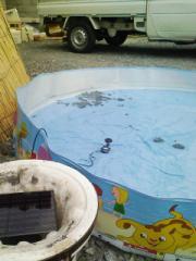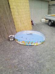 ってミニプールが。空気を入れるタイプは径が小さい上に1500円位するし、タライも考えたけど、径が56センチで1500円くらいするんだよなぁ。