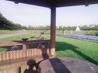 さて、午後は本日のラッキー方位が南東だったので、K市名物、謎のブランコの付近の屋外テーブルに陣取って秋口の気持ちよい空気の中・・・