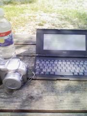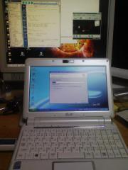 で、ちょっと使ってみましたが、これはイイですね! 現在、持ち運びの便利さから、13年くらい前の名機、モバイルギア(モノクロ、乾電池使用で25時間連続稼動)を使ってますが、このEeeはそれに迫る使い勝手の良さ! バッテリーだけど9時間も持つし、HDDじゃないので無音(静音じゃなくて無音)だし、何より・・・何よりも