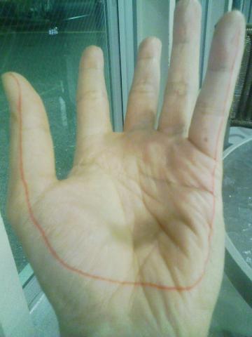 終了後、例のツボ療法の話をする。今回の画像の赤線の部分は胃系のラインなんだけど、ここらへんが当然硬い。この方は以前胃ガンで胃を切除されているので、それは不思議ではないのだけど、この小指と親指というのは、ちょうど両足の反射ポイントでもあるのだ。